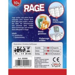 Bei dem Kartenspiel Rage sagen die Spieler vorher, wie ihre Runde verlaufen wird. Kommt dann doch alles ganz anders, lässt sich das Blatt mit Aktionskarten und cleverem Spiel wenden. Jeder Spieler versucht, seine eigene Vorhersage zu erfüllen und die Mitspieler in Rage zu versetzen.