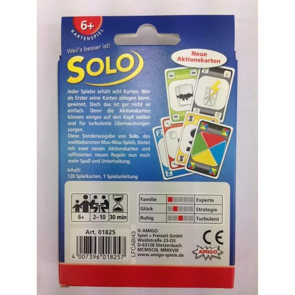 Diese Sonderausgabe von Solo, des weltberühmten Mau-Mau-Spiels, bietet mit zwei neuen Aktionskarten und raffinierten neuen Regeln nun noch mehr Spaß und Unterhaltung.