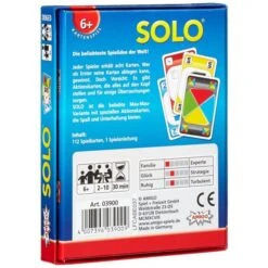 Die beliebteste Spielidee der Welt. Und dabei im Spielverlauf ganz einfach – wären da nicht einige Fallen eingebaut: Neue Aktionskarten, die stets für Überraschungen sorgen. Ob jemand sein Spiel verlängern oder ganz aussetzen muss, ob die Spielrichtung geändert wird, oder die Karten als Joker gelten – für Unterhaltung ist mit Solo, der spannenden Mau-Mau-Variante, allemal gesorgt.