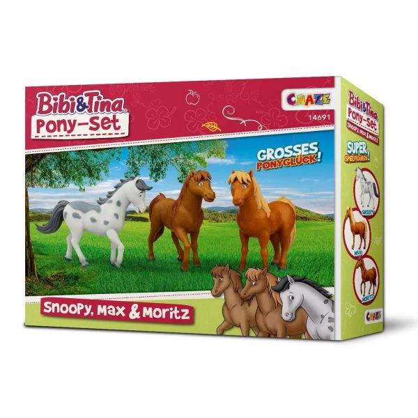 Mit dem BIBI & TINA Pony-Set können kleine Pferde-Fans die spannenden Abenteuer auf dem Martinshof nun auch selbst nachspielen. Im Set enthalten sind die 3 süßen Ponys Moritz, Max und Snoopy.