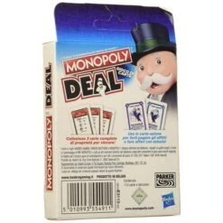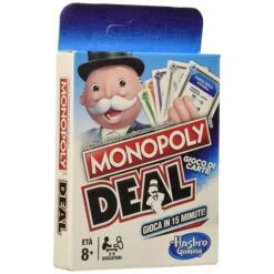 Das berühmte Spiel um den großen Deal – hier als schnelles Kartenspiel! Unter den 110 Karten sind Besitzrechtkarten ebenso wie Mietkarten, Haus- und Hotelkarten, Grundstücksjoker und natürlich Geldkarten. Außerdem jede Menge Ereigniskarten, mit denen zusätzliche Mietzahlungen erhoben werden. Wie im Brettspiel wird die Miete durch den Kauf von Haus- und Hotelkarten höher. Grunstücksjoker helfen beim Zusammenstellen von Grundstücks-Sets. Und wer als Erster drei Sets gesammelt hat, gewinnt! Das Spiel ist ein superleichter Einstieg in die Welt von Monopoly mit einer Spieldauer von nur 15 Minuten.