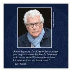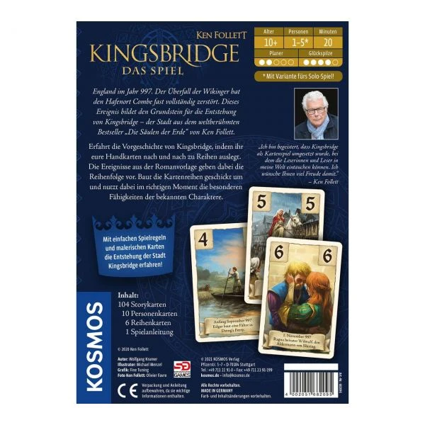 Nach dem Überfall der Wikinger im Jahre 997 erfahren die 1-6 Spieler ab 10 Jahren in diesem Kartenspiel, wie die Stadt Kingsbridge aus dem weltberühmten Bestseller-Roman „Die Säulen der Erde“ von Ken Follett entstand. Mit Hilfe von Storykarten, die nach der zeitlichen Abfolge der Buchvorlage ausgelegt werden, werden die Spieler ins englische Mittelalter hineingeführt. Auf diesen Karten wird die Handlung des Romans anschaulich dargestellt. Personenkarten mit ihren besonderen Fähigkeiten unterstützen dabei. Mit einfachen Regeln und atmosphärisch gestalteten Spielkarten ist das Kartenspiel sofort startklar! Eine besondere Solo-Spielregel ermöglicht spannende Herausforderungen auch für einen Spieler allein.