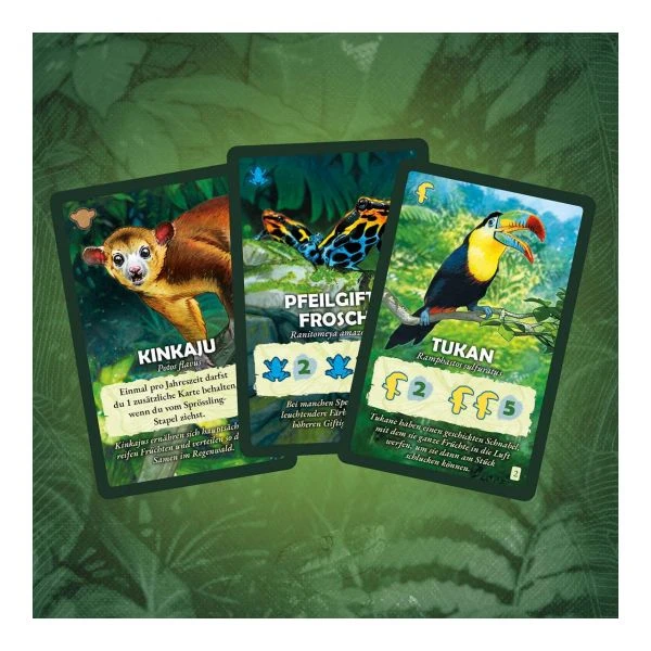 Wow! Bei diesem Spiel entsteht Spielkarte für Spielkarte ein wunderschöner Regenwald. Die Spieler draften die Karten und verschönern ihr kleines Paradies. Dabei müssen sie immer wieder ihre Entscheidungen abwägen. Die nächste gezogene Spielkarte könnte eine Dürre-Karte sein! Wer auf Karten verzichtet, beeinflusst die Auslage und kann beim nächsten Spielzug umso mehr gewinnen. Schon bald leben in diesem Kartenspiel Tukan und Faultier im Regenwald und es wachsen noch mehr unglaubliche Pflanzen. Wer am Ende von drei Jahreszeiten eine neue Heimat für die schönsten Bäume und Pflanzen und die meisten Tiere erschaffen hat, gewinnt den Wettstreit! Ein tolles Gesellschaftsspiel und Geschenk mit Urlaubs-Feeling!