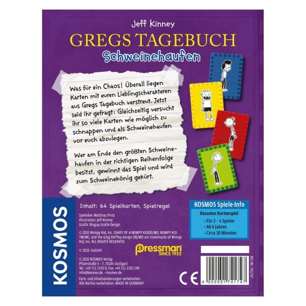 Wow, was für ein Durcheinander! In der Tischmitte liegen die Karten mit den Figuren aus der beliebten Buchserie „Gregs Tagebuch“ von Jeff Kinney aus – natürlich verdeckt. Jetzt geht das Spiel los! Die zwei bis vier Spieler schnappen sich gleichzeitig eine Karte nach der anderen und sehen sie sich an. Dabei sind blitzschnelle Reaktion und Konzentration gefragt. Zeigt die Karte eine passende Figur oder Hintergrundfarbe? Dann ab damit auf den Schweinehaufen. Ansonsten kommt die Karte zurück in die Mitte. Das Kinderspiel gewinnt am Ende, wer die meisten Karten auf seinem Schweinehaufen sammelt, ohne dabei zweimal hintereinander die gleiche Figur oder Hintergrundfarbe zu haben. Ein lustiges und turbulentes Kartenspiel für Kinder ab 6 Jahren! Perfekt als Reisespiel und Mitbringsel.