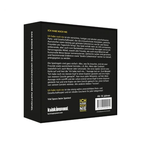 Ich habe noch nie ist ein verrücktes, lustiges und absolut unterhaltsames Party- und Gesellschaftsspiel, das die erstaunlichsten Anekdoten, peinliche Ausrutscher sowie bislang gut gehütete Geheimnisse von Dir und Deinen Freunden ans Tageslicht bringt.Das Spiel enthält mehr als 200 unerwartete, entlarvende, aber auch zum Nachdenken animierende Aussagen und ist ein hervorragendes Mittel, sowohl alte Freunde, wie auch neue Bekannte auf humorvolle Weise besser kennenzulernen. Zahlreiche Lacher sind garantiert und faszinierende Erlebnisse sowie dunkle Geheimnisse warten nur darauf, preisgegeben zu werden.