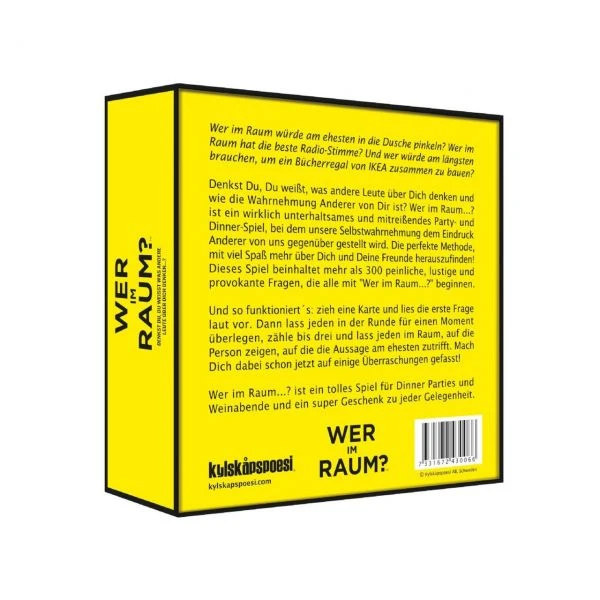 Wer im Raum? ist ein wirklich unterhaltsames und mitreißendes Party- und Dinner-Spiel, bei dem unsere Selbstwahrnehmung und der Eindruck Anderer von uns einander gegenüber gestellt werden. Eine perfekte Methode, mit viel Spaß mehr über sich und seine Freunde herauszufinden! ? Das Spiel beinhaltet über 300 peinliche, lustige und provokante Fragen, die alle mit Wer im Raum? beginnen.