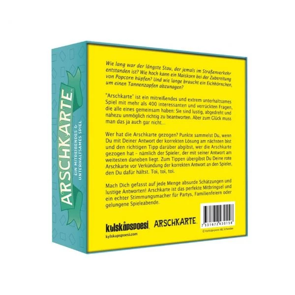 Arschkarte ist ein mitreißendes und extrem unterhaltsames Spiel mit mehr als 400 interessanten und verrückten Fragen, die alle eines gemeinsam haben: Sie sind lustig, abgedreht und nahezu unmöglich richtig zu beantworten. Aber zum Glück muss man das ja auch gar nicht… Wer hat die Arschkarte gezogen? Punkte sammelst Du, wenn Du mit Deiner Antwort der korrekten Lösung am nächsten bist und den richtigen Tipp darüber abgibst, wer die Arschkarte gezogen hat – nämlich der Spieler, der mit seiner Antwort am weitesten daneben liegt. Zum Tippen übergibst Du Deine rote Arschkarte vor Verkündung der korrekten Antwort an den Spieler, den Du dafür hältst. Toi, toi, toi.