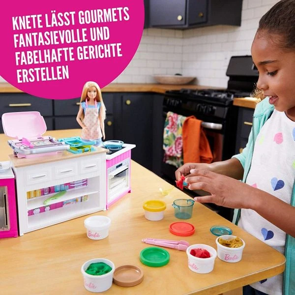Rollenspielen und köstlichen Küchenabenteuern an. Die Barbie-Puppe trägt