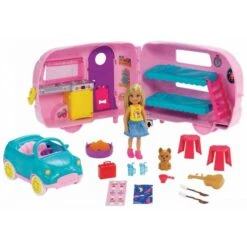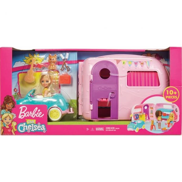 Chelsea und ihr Hündchen freuen sich schon riesig darauf, überall zu campen – selbst in ihrem eigenen Garten. Denn sie haben ein ganz besonderes Fahrzeug: Der Chelsea Camper lässt sich von dem Auto abkoppeln und verwandelt sich in ein Campingplatz-Spielset, das als zweites Zuhause dient! Den Camper für die Reise einfach an das Auto hängen und am Ziel wieder abkoppeln. Wird der Camper geöffnet, umfasst er eine Küche mit Spüle, Herd und Kühlschrank (mit einer funktionierenden Tür!) und zwei Stockbetten (mit einer Leiter!), damit auch immer noch ein Freund mitkommen kann. Es gibt sogar eine Hundeklappe, damit das Hündchen ein und aus gehen kann, wann es möchte. Mehr als 10 Spielzeugteile inspirieren die Kinder zu tollen Camping-Geschichten und -Liedern – es locken eine Feuerstelle, eine Gitarre, zwei Stühle und zwei Spieße mit Marshmallows, die für klassische Camping-Momente sorgen. Aber das ist noch nicht alles, denn es gibt auch zwei Getränke, einen Topf, ein Geschirrtuch, eine Decke und einen Koffer. Und wenn es Zeit zum Weiterfahren ist, bietet das Spielset genügend Platz, um alle Teile zu verstauen – selbst im Kofferraum des Autos. Chelsea ist bereit, die Welt zu bereisen. Dafür trägt sie ein leuchtend gelbes Tanktop mit „Happy Camper“-Aufdruck, einen blauen Rock mit weißen Pünktchen und pinkfarbene Schuhe. Und ihr Hündchen hat einen entzückenden Gesichtsausdruck, denn es freut sich schon riesig auf die Abenteuer! Kinder werden es lieben, die Welt mit diesem Spielset zu erkunden. Zusammen bieten die Club Chelsea-Puppen und Spielzeuge noch mehr Spielmöglichkeiten (alle Artikel separat erhältlich). Enthält eine Chelsea-Puppe mit Rock und Schuhen, ein Hündchen, ein Auto, einen Camper, eine Gitarre, eine Feuerstelle, zwei Stühle, zwei Marshmallow-Spieße, zwei Getränke, einen Topf, ein Geschirrtuch, eine Decke und einen Koffer. Abweichungen in Farbe und Gestaltung vorbehalten.