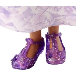 fantasievollen Geschichten an. Die Barbie-Puppe trägt ein lila