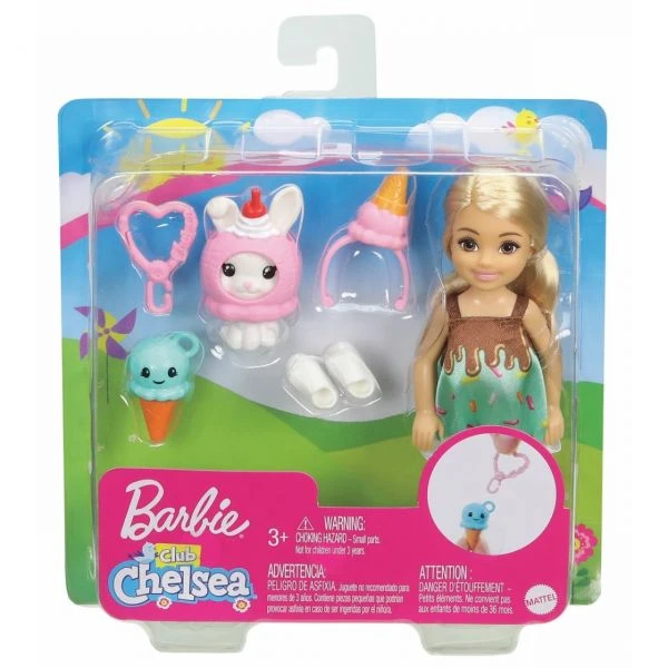 Chelsea und ihre Freunde wecken in Kindern den Entdeckergeist! Genau wie die große Schwester Barbie probieren sie gerne Neues aus, stellen sich Herausforderungen und haben Spaß. Mit den ca. 15 cm großen Chelsea-Puppen in individuellen Kostümen können Kinder viele lustige Geschichten nachspielen! Diese Chelsea-Puppe sieht in ihrem Eiscreme-Kostüm einfach zuckersüß aus. Ihr farbenfrohes Kleid ist mit bunten Zuckerstreuseln bedruckt und hat einen Rüschensaum, der an Schlagsahne erinnert. Ein Eiswaffel-Haarband, eine pinkfarbene Strumpfhose und weiße Schuhe sorgen für noch mehr Spaß beim Verkleiden, während ihr Häschen sie im passenden Kostüm auf Schritt und Tritt begleitet. Mit Hilfe eines schmucken Schlüsselbandes lässt sich die Chelsea-Puppe einfach an einem Rucksack oder der Kleidung befestigen, um sie zum Spielen mit zu Freunden zu nehmen. In der Fantasie erleben die kleinen Puppen große Abenteuer. Zusammen sorgen alle Chelsea-Puppen und Spielzeuge für noch mehr Spaß beim Geschichtenerzählen (alle Artikel separat erhältlich). Die Puppe kann nicht von allein stehen. Abweichungen in Farbe und Gestaltung vorbehalten.