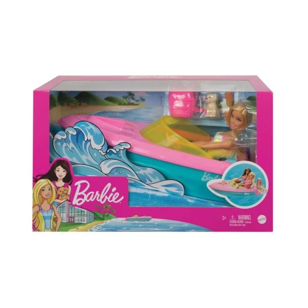 Mit der Barbie Puppe, ihrem Hündchen und dem Boot, das auf dem Wasser treibt, können sich junge Fans Geschichten an Land und im Wasser ausdenken! Mit coolen Funktionen, farbenfrohem Design und Platz für drei Puppen (andere Puppe separat erhältlich) können Kinder das Schnellboot beladen und damit viele Abenteuer erleben. Die Barbie-Puppe kann die leuchtend pinke Rettungsweste anziehen und über die Wellen reiten. Anschließend kann sie mit dem Boot anlegen und mit den Tassenhalterungen mit Steckvorrichtung und Getränkezubehör entspannen. Kinder im Alter von 3 bis 7 können dieses Barbie-Boot mit ans Wasser nehmen oder in ihrer Fantasie damit den Ozean entdecken. Den Möglichkeiten sind keine Grenzen gesetzt! Die Puppe kann nicht von allein schwimmen oder stehen. Abweichungen in Farbe und Gestaltung vorbehalten. Aufsicht von Erwachsenen empfohlen.
