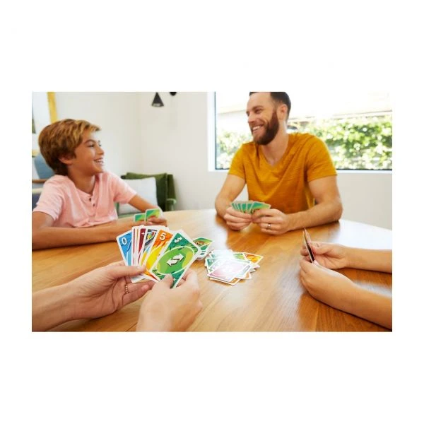 Die Cellophanhülle um die Karten wurde durch Papier ersetzt, um das Spiel umweltfreundlicher zu gestalten – das komplette Kartenspiel und die Verpackung können jetzt recycelt werden. Die auf Soja basierte Tinte, die für diese Karten aus Papier verwendet wird, erzeugt kräftige, natürliche Farben, die unschädlich und unverwechselbar sind. Das Kartenspiel ist mit dem klassischen UNO identisch und enthält Jokerkarten und Herausforderungskarten, die dem Spiel einen ganz neuen Verlauf geben können. Ganz wichtig: Wer nur noch eine Karte auf der Hand hat, muss „UNO!“ rufen. Abweichungen in Farbe und Gestaltung vorbehalten.