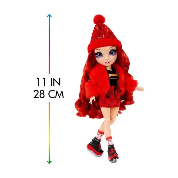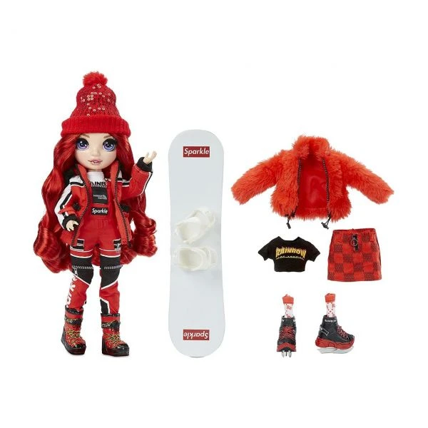 - SIGNATURE WINTER STYLING – Ruby bringt 2 komplette Winteroutfits in ihrem charakteristischen Rot, Schneeausrüstung und Accessoires mit. Das Snowboard wird zum Puppenständer, um die neuen Looks zu präsentieren, die du aus ihren Outfits zauberst