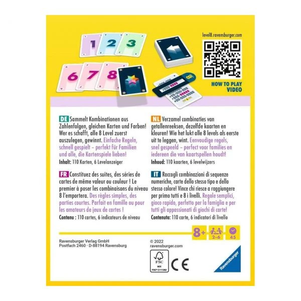 Level 8 – das Kartenspiel: 2 – 6 Spieler wetteifern Level für Level um den Sieg. Zu Beginn bekommt jeder Mitspieler eine Level-Karte mit allen acht Aufgaben sowie einen Level-Anzeiger der angibt in welchem Level man sich befindet. Wer legt die geforderten Kombinationen aus Zahlenfolgen, gleichen Karten und gleichen Farben am schnellsten aus? Einfache Regeln, schnelle Entscheidungen, großer Spielspaß! Das Familienspiel ab 8 Jahren eignet sich ideal für jeden Spieleabend.