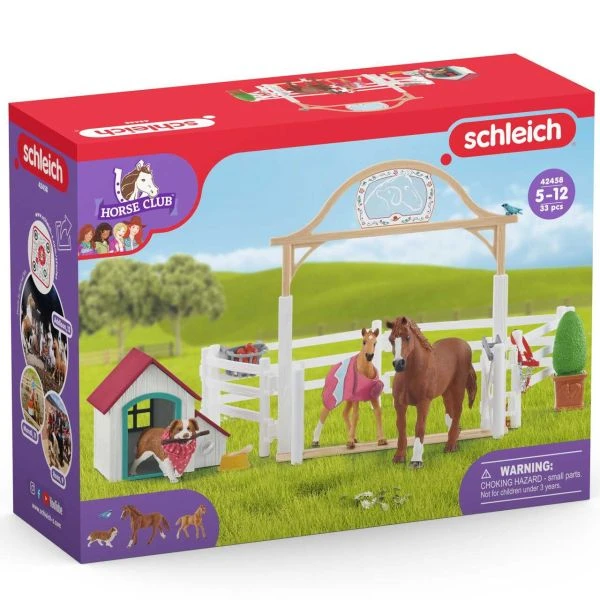 Inhalt: 1x Appaloosa Stute, 1x Appaloosa Fohlen, 1x Hündin Ruby, 1x Hundehütte, 4x Paddocks, 1x Eingangstor, 1x Fohlendecke, 1x Stallhalfter, 1x Obstkiste, 1x Äpfel rot, 1x Raufe, 1x Eimer, 1x Buchsbaum, 1x Knochen, 1x Stock, 1x Hundenapf, 1x Hundehalsband