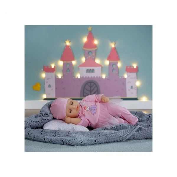 Wenn man die 30 cm große Puppe auf den Rücken legt, schließt sie ihre Schlafaugen. Ihr Körper ist weich gestopft und lädt zu verspielten Kuschelstunden ein. Zusätzlich bringt sie ein Fläschchen für erstes (Rollen-)Spiel mit.